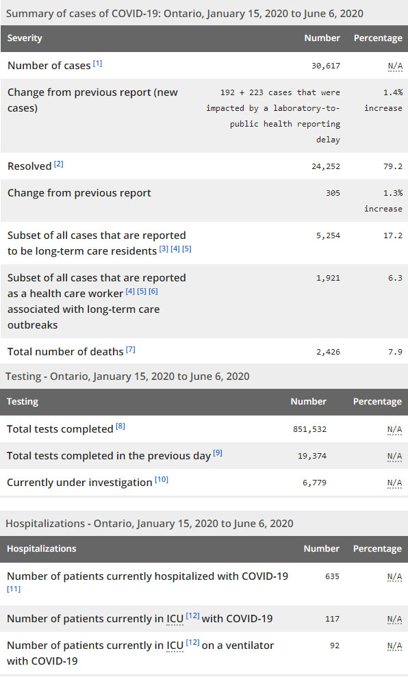 再看看安省方面的详细数据,截止6月6日上午10:30点,安省已对851532行了新冠病毒检测(检测数较昨天新增19374例),还有6779处于被调查阶段。确诊总数30617(较昨天新增415,确诊率上升至2.1%,其中有223例属于报告延迟),包括24252例康复(康复率为79.2%)、2426例死亡(截止6月7日死亡又增加到2485例,这是CBC统计的最新死亡数据,死亡人数较昨天增加19例,死亡率下降为8.1%)。住院患者635例(减少38例,连续2日少于700以下);进入ICU患者117例(未变);IU插呼吸机患者92例(减少5)。