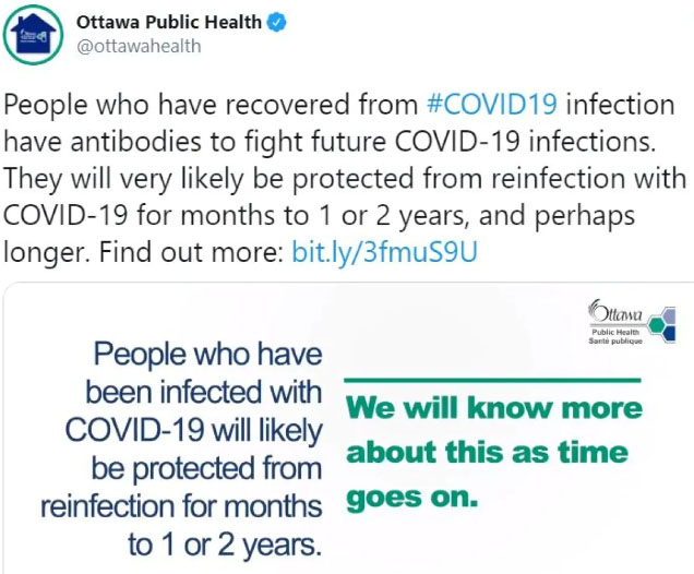 —— 渥太华公共卫生局在6月5日发布Twitter称,感染新冠病毒后康复的人很可能受到长达两年甚至更长的免疫保护。随后,渥太华公共卫生局删除了这条Twitter,称这条消息有误,有可能会误导大众,因为与加拿大联邦卫生部的一再声明不符。