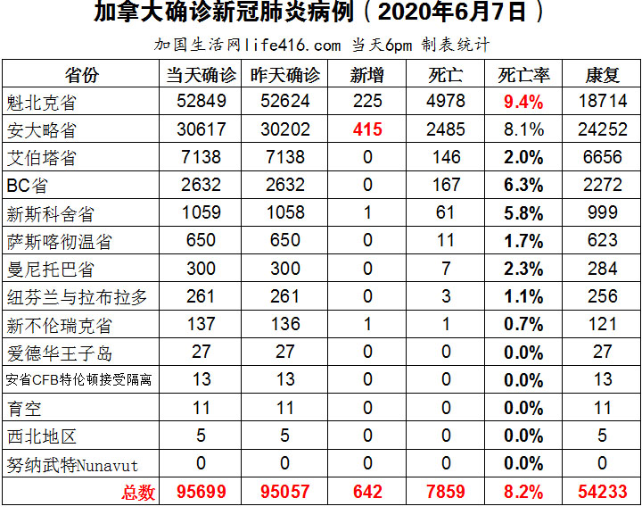 【加国生活网编译报道】截至6月7日下午6点,加拿大确诊新冠病例总数95699(新增647),死亡7859。魁省确诊总数52849(当日新增225),死亡4978,死亡率9.4%仍为加拿大死亡率最高省份。安省确诊总数30617例(当日新增415,包括延迟漏报223例),死亡总数2485例(当日新增19例),死亡率下降至8.1%。新冠患者康复后免疫力能维持多久仍是未知数,切勿放松警惕;世卫组织终于改口,呼吁全世界民众多戴非医用口罩。加国生活网专门制作了如下统计数据表: