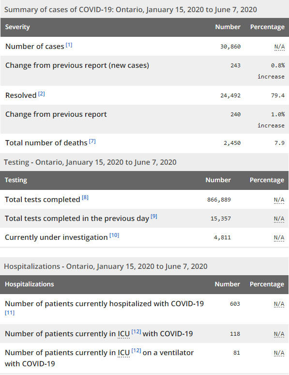 再看看安省方面的详细数据,截止6月7日上午10:30点,安省已对866889行了新冠病毒检测(检测数较昨天新增15357例,低于1.6万标准),还有4811处于被调查阶段。确诊总数30860(较昨天新增243,确诊率下降至1.6%),包括24492例康复(康复率为79.4%)、2450例死亡(截止6月8日死亡又增加到2508例,这是CBC统计的最新死亡数据,死亡人数较昨天增加23例,死亡率仍为8.1%)。住院患者603例(减少32例,连续3日少于700以下);进入ICU患者118例(增加1);IU插呼吸机患者81例(减少11)。