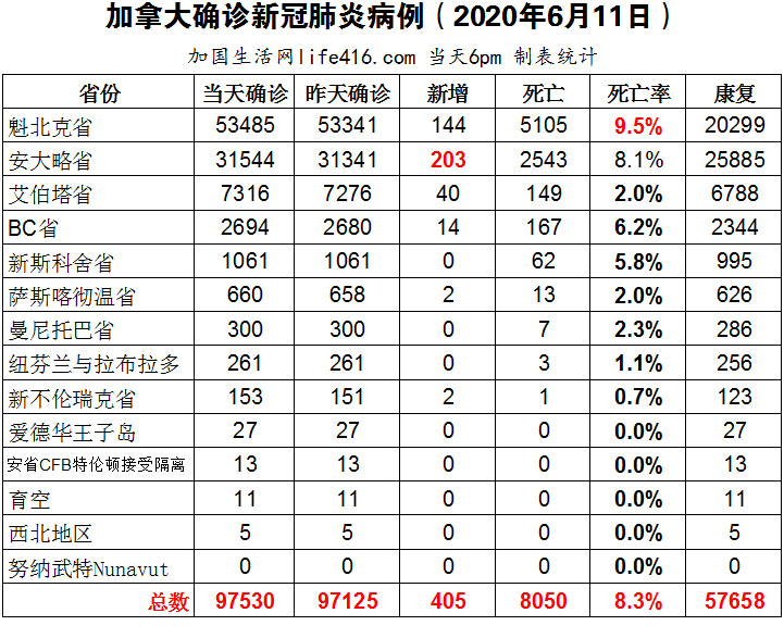 【加国生活网编译报道】截至6月11日下午6点,加拿大确诊新冠病例总数97530(新增405,连续3日低于500),死亡8050。魁省确诊总数53485(当日新增144,连续4日低于200),死亡5105,死亡率9.5%仍为加拿大死亡率最高省份。安省确诊总数31544例(当日新增203,连续4日低于300),死亡总数2543例(当日新增8例,首日低于10例),死亡率仍为8.1%。多伦多和万锦市均打算从7月2日起,强制要求乘坐公交系统的乘客佩戴口罩或面罩。加国生活网专门制作了如下统计数据表: