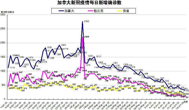 加国生活网小编统计了从4月1日至6月16日每日新增确诊数,制作了如下曲线图,分别统计了全加拿大(蓝色)和确诊数最多的两个省魁北克省(粉色)和安省(黄色)三组数据,大家可以了解一下进行4月份以来加拿大新冠疫情的发展趋势。加拿大、魁省新增确诊数较昨日均继续下降。安省从昨天的181稍微上升到184,好在是连续3日低于200例,目前仍保持下降趋势。