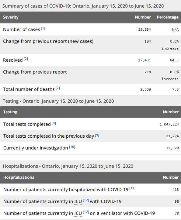 再看看安省方面的详细数据,截止6月15日上午10:30点,安省已对1047224例行了新冠病毒检测(检测数较昨天新增21724例),还有17920处于被调查阶段。确诊总数32554(较昨天新增184,确诊率上升至0.85%),包括27431例康复(康复率为84.3%)、2538例死亡(截止6月16日死亡又增加到2595例,这是CBC统计的最新死亡数据,死亡人数较昨天增加16例,死亡率仍为8.0%)。住院患者413例(减少6例,连续4日少于500以下);进入ICU患者98例(减少6);IU插呼吸机患者70例(增加1)。