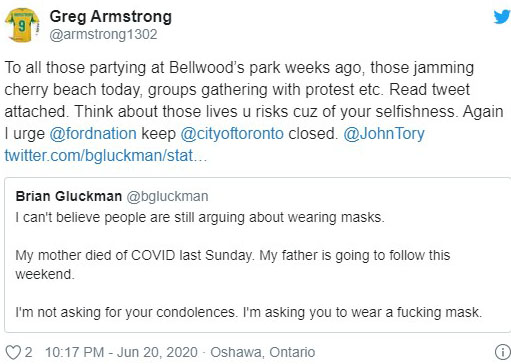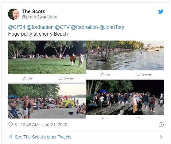 网友们纷纷表示,疫情仍在,省府禁令也在,这些人就如此自私自利,还不如让省长福特不准许多伦多进入第二阶段。