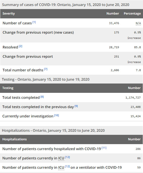 再看看安省方面的详细数据,截止6月20日上午10:30点,安省已对1174727例行了新冠病毒检测(检测数较昨天新增23408例),还有15424处于被调查阶段。确诊总数33476(较昨天新增175,确诊率仍0.75%),包括28719例康复(康复率为85.8%)、2606例死亡(截止6月21日死亡又增加到2647例,这是CBC统计的最新死亡数据,死亡人数较昨天增加7例,死亡率为7.9%)。住院患者286例(减少47,首日少于300以下);进入ICU患者86例(增加6);IU插呼吸机患者59例(减少4)。