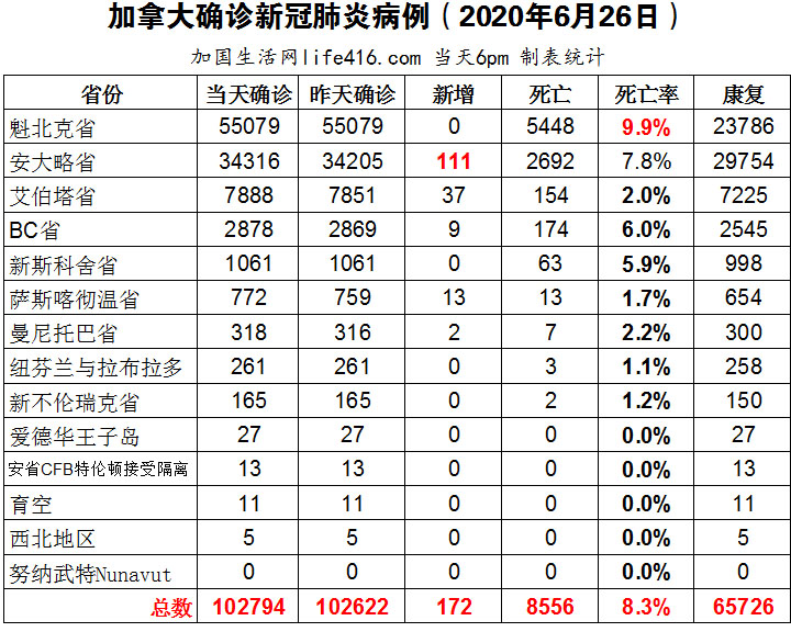 【加国生活网编译报道】截至6月26日下午6点,加拿大确诊新冠病例总数102794(当日新增172),死亡8556。魁省确诊总数55079(当日未发布数据),死亡5448,死亡率仍为9.9%。安省确诊总数34316例(当日新增111,连续3日低于200),死亡总数2692例(当日新增3例)。加拿大生产的新冠防护设备可以实现自给自足;因公众强烈批评,魁省将恢复每天更新疫情数据;安省Kingston发布口罩强制令只因美甲沙龙爆发新冠疫情。加国生活网专门制作了如下统计数据表: