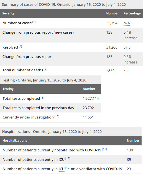再看看安省方面的详细数据,截止7月4日上午10:30点,安省已对1527114例行了新冠病毒检测(检测数较昨天新增23792例),还有11651处于被调查阶段。确诊总数35794(较昨天新增138,确诊率上升至0.58%),包括31266例康复(康复率上升至87.3%)、2689例死亡(截止7月5日死亡又增加到2734例,这是CBC统计的最新死亡数据,死亡人数较昨天增加1例,死亡率下降至7.6%)。住院患者139例(减少11);进入ICU患者39例(未变);IU插呼吸机患者23例(减少3)。