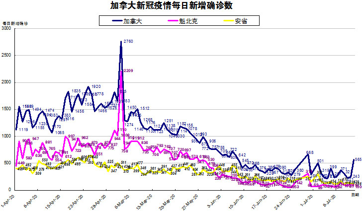加国生活网小编统计了从4月1日至7月13日每日新增确诊数,制作了如下曲线图,分别统计了全加拿大(蓝色)和确诊数最多的两个省魁北克省(粉色)和安省(黄色)三组数据,大家可以了解一下进行4月份以来加拿大新冠疫情的发展趋势。加拿大较昨天有大幅上升,从昨天的243上升到今天的565,究其原因是有几个省在周末没有更新数据,包括艾省新增230、BC省新增62、萨省新增56。而魁省从昨天的114下降至今天的100;安省从昨天的129下降到今天的116,连续14天在200以下。