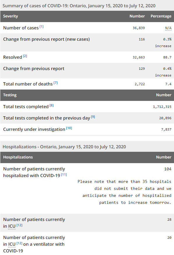 再看看安省方面的详细数据,截止7月12日上午10:30点,安省已对1712315例行了新冠病毒检测(检测数较昨天新增20896例),还有7837处于被调查阶段。确诊总数36839(较昨天新增116,确诊率上升至0.55%),包括32663例康复(康复率上升至88.7%)、2722例死亡(截止7月13日死亡仍是2759例,这是CBC统计的最新死亡数据,死亡人数较昨天增加4,死亡率仍为7.5%)。住院患者104例(注意由于35家医院周末没有提交数据,这个数值在明天可能会有大幅上升);进入ICU患者28例(减少1);IU插呼吸机患者20例(增加1)。
