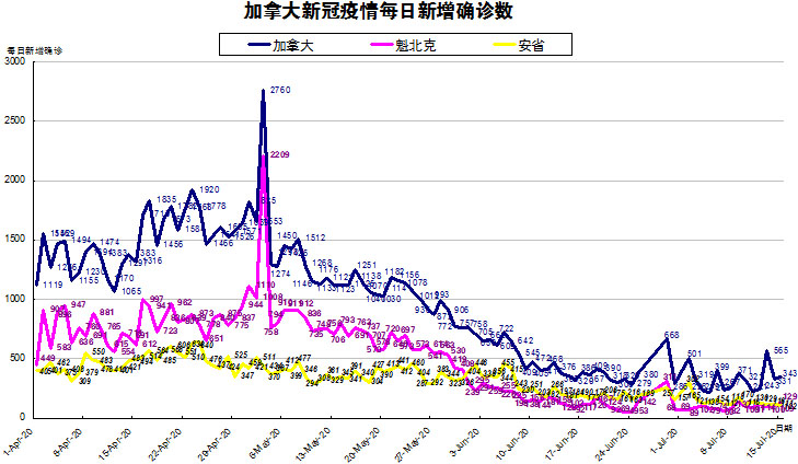 加国生活网小编统计了从4月1日至7月15日每日新增确诊数,制作了如下曲线图,分别统计了全加拿大(蓝色)和确诊数最多的两个省魁北克省(粉色)和安省(黄色)三组数据,大家可以了解一下进行4月份以来加拿大新冠疫情的发展趋势。加拿大较昨天又有小幅上升,从昨天的331上升到今天的343,艾省最近几天的新增病例一直在80多,将加拿大原本在200多的数值又拉升到300多。魁省和安省则一直保持现状,魁省从昨天的109上升至今天的129;安省从昨天的111下降到今天的102,不仅连续16天在200以下,而且还创了是自3月25日以来最少新增病例数。