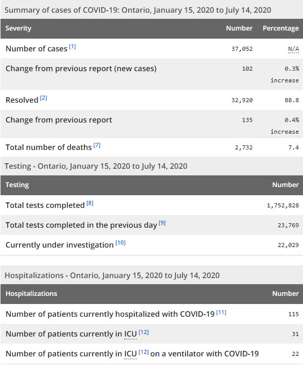 再看看安省方面的详细数据,截止7月14日上午10:30点,安省已对1752828例行了新冠病毒检测(检测数较昨天新增23769例),还有22029处于被调查阶段。确诊总数37052(较昨天新增102,确诊率下降至0.43%),包括32920例康复(康复率上升至88.8%)、2732例死亡(截止7月15日死亡仍是2770例,这是CBC统计的最新死亡数据,死亡人数较昨天增加9,死亡率仍为7.5%)。住院患者115例(减少22);进入ICU患者31例(增加1);IU插呼吸机患者22例(增加1)。