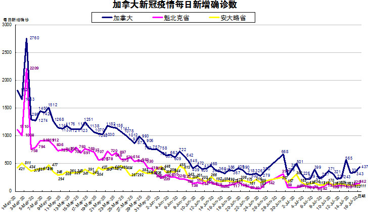 加国生活网小编统计了从5月1日至7月16日每日新增确诊数,制作了如下曲线图,分别统计了全加拿大(蓝色)和确诊数最多的两个省魁北克省(粉色)和安省(黄色)三组数据,大家可以了解一下进行5月份以来加拿大新冠疫情的发展趋势。加拿大较昨天又有大幅上升,从昨天的343上升到今天的437,艾省的新增病例继续上涨突破百例至120,将加拿大原本在300多的数值又拉升到400多。魁省和安省则一直保持现状,魁省从昨天的129上升至今天的142;安省从昨天的102上升到今天的111,连续17天在200以下。