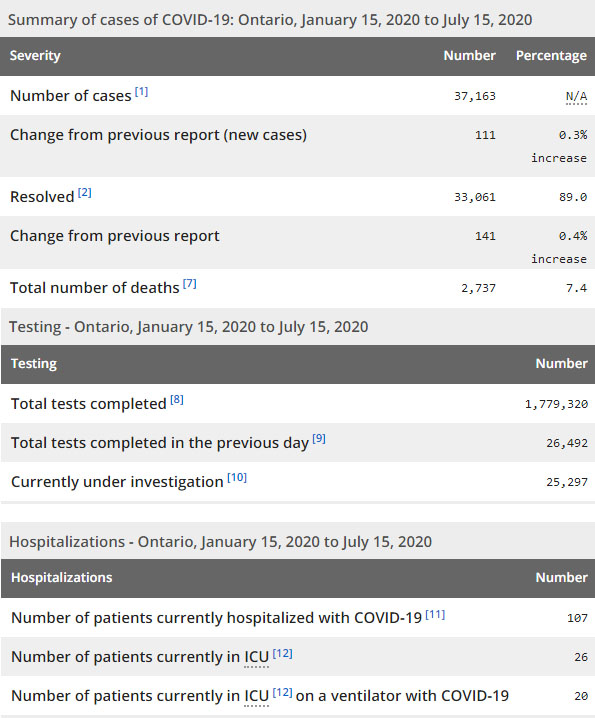 再看看安省方面的详细数据,截止7月15日上午10:30点,安省已对1779320例行了新冠病毒检测(检测数较昨天新增26492例),还有25297处于被调查阶段。确诊总数37163(较昨天新增111,确诊率下降至0.42%),包括33061例康复(康复率上升至89%)、2737例死亡(截止7月16日死亡2772例,这是CBC统计的最新死亡数据,死亡人数较昨天增加2,死亡率仍为7.5%)。住院患者107例(减少8);进入ICU患者26例(减少5);IU插呼吸机患者20例(减少2)。