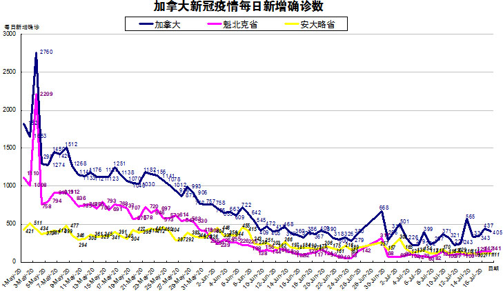 加国生活网小编统计了从5月1日至7月17日每日新增确诊数,制作了如下曲线图,分别统计了全加拿大(蓝色)和确诊数最多的两个省魁北克省(粉色)和安省(黄色)三组数据,大家可以了解一下进行5月份以来加拿大新冠疫情的发展趋势。加拿大较昨天又有小幅下降,从昨天的437下降到今天的405,艾省的新增病例也继续保持在百例至105,将加拿大原本在300多的数值又拉升到400多。魁省和安省则一直保持现状,魁省从昨天的142小降至今天的141;安省则维持从昨天的111未变,连续18天在200以下。