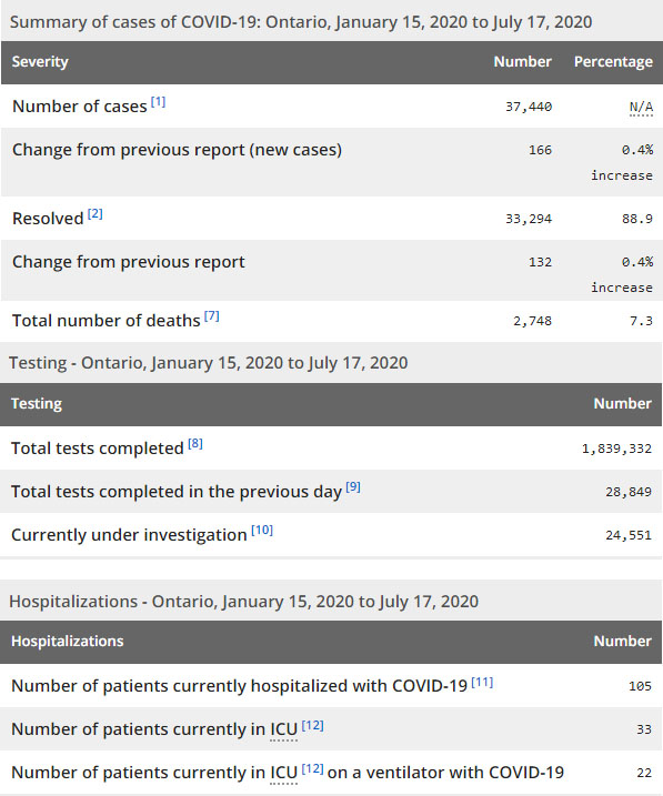 再看看安省方面的详细数据,截止7月17日上午10:30点,安省已对1839332例行了新冠病毒检测(检测数较昨天新增28849例),还有24551处于被调查阶段。确诊总数37440(较昨天新增166,确诊率上升至0.58%),包括33294例康复(康复率下降至88.9%)、2748例死亡(截止7月18日死亡2781例,这是CBC统计的最新死亡数据,死亡人数较不仅没有增加反而还撤回1例,死亡率下降为7.4%)。住院患者105例(减少3);进入ICU患者33例(增加3);IU插呼吸机患者22例(增加1)。
