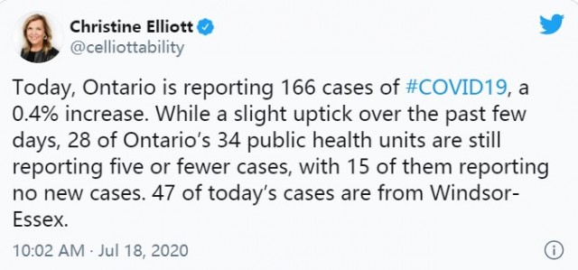 —— 安省卫生厅长Christine Elliott在7月18日发布Twitter称,当天新增确诊了166例,是最近一些天以来出现的小反弹。当日的新增患者主要集中在多伦多和温莎地区,这两个区域分别新增了47名确诊患者。同时,皮尔区新增确诊13人,约克区新增6人。另外,在全省34个地区公共卫生部门中,有28个地区的新增病例在5人或以下,15个地区无新增。