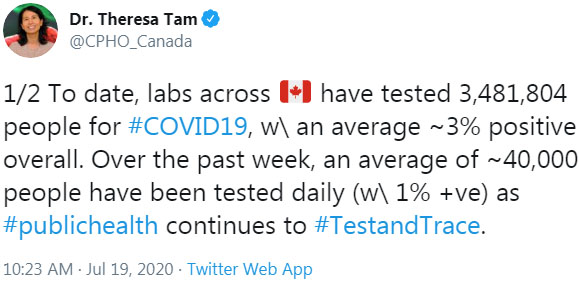 根据加拿大首席卫生官Dr. Theresa Tam在其Twitter所发布的数据显示,截止7月19日,加拿大共检测了3481804,确诊110340,确诊率是3.16%,低于WHO规定的5%。