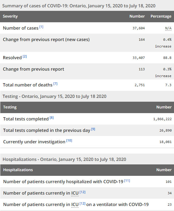 再看看安省方面的详细数据,截止7月18日上午10:30点,安省已对1866222例行了新冠病毒检测(检测数较昨天新增26890例),还有18081处于被调查阶段。确诊总数37604(较昨天新增164,确诊率上升至0.61%),包括33407例康复(康复率下降至88.8%)、2751例死亡(截止7月19日死亡2781例,这是CBC统计的最新死亡数据,死亡人数清零,死亡率仍为7.4%)。住院患者101例(减少4);进入ICU患者34例(增加1);IU插呼吸机患者23例(增加1)。