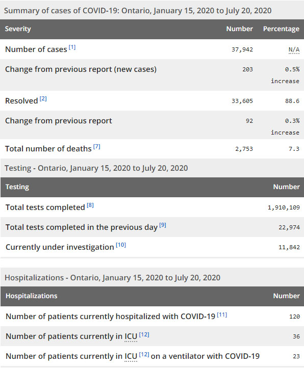 再看看安省方面的详细数据,截止7月20日上午10:30点,安省已对1910109例行了新冠病毒检测(检测数较昨天新增22974例),还有11842处于被调查阶段。确诊总数37942(较昨天新增203,确诊率上升至0.88%),包括33605例康复(康复率下降为88.6%)、2753例死亡(截止7月21日死亡2785例,这是CBC统计的最新死亡数据,死亡人数较昨天没有变化,死亡率下降为7.3%)。住院患者120例(增加5);进入ICU患者36例(减少1);IU插呼吸机患者23例(减少1)。