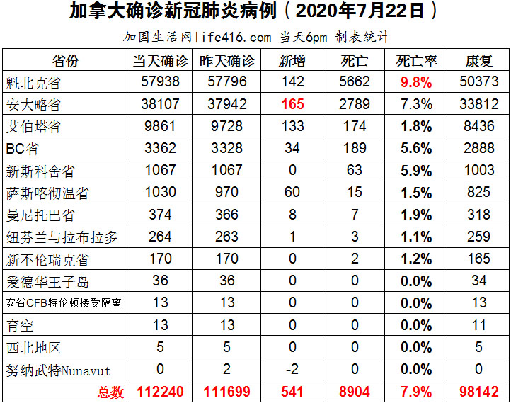 【加国生活网编译报道】截至7月22日下午6点,加拿大确诊新冠病例总数112240(当日新增541),死亡8904。魁省确诊总数57938(当日新增142);安省确诊总数38107(当日新增165);艾省确诊总数9861(当日新增133);BC省确诊总数3362(当日新增34)。随着新冠确诊数量的不断攀升,BC省将会对酒吧和夜总会采取新措施;到底是什么原因导致了魁省疫情的突然逆转?加航将于8月7日恢复中加航线运营,首先复航的是温哥华至上海浦东航线,每周一班。加国生活网专门制作了如下统计数据表: