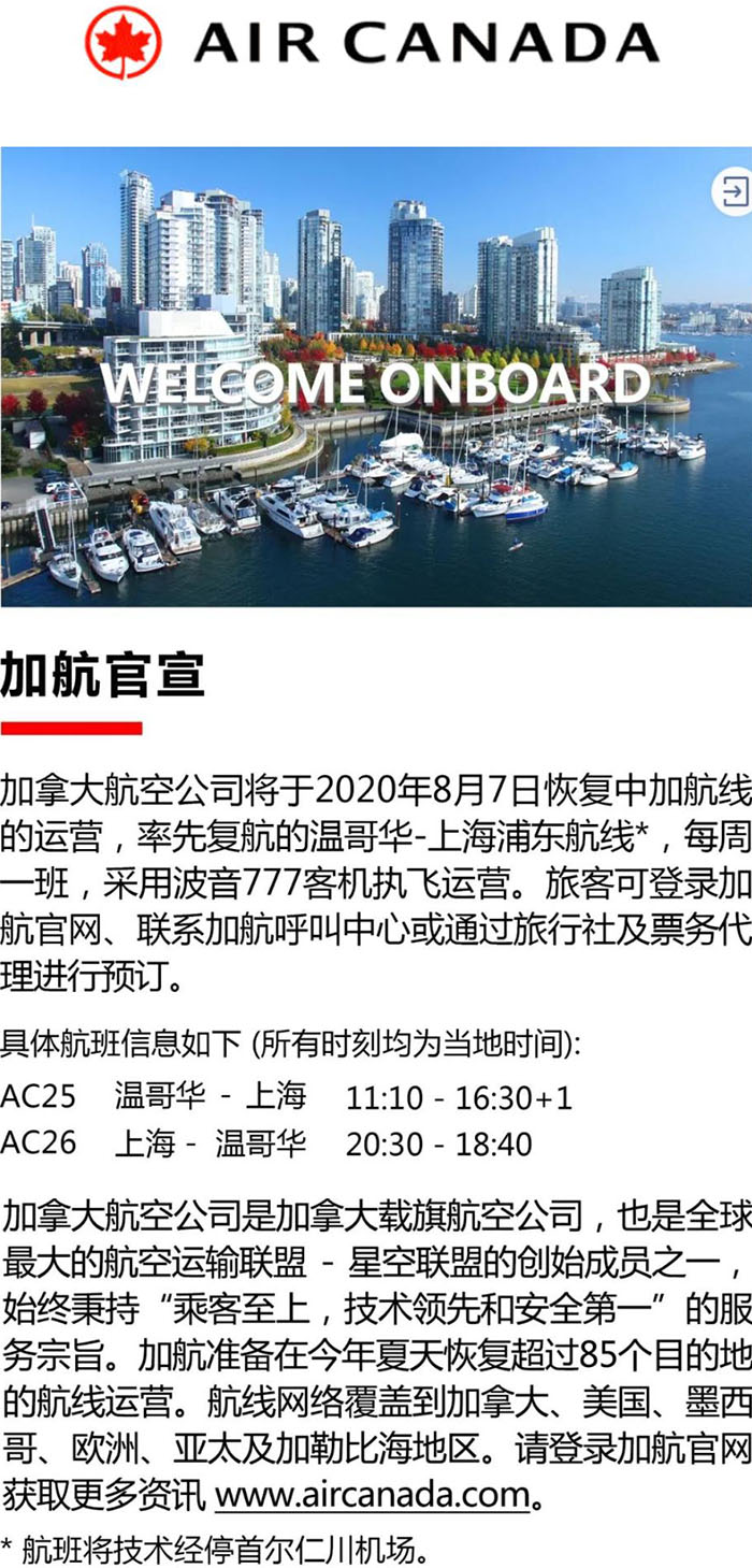 —— 好消息:加拿大航空公司将于2020年8月7日恢复中加航线的运营,首先复航的是温哥华至上海浦东航线,每周一班。详情见下图或请点击这里。