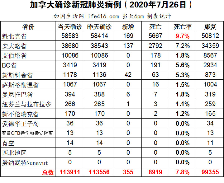 【加国生活网编译报道】截至7月26日下午6点,加拿大确诊新冠病例总数113911(当日新增355),死亡8919。魁省确诊总数58583(当日新增169);安省确诊总数38680(当日新增137);艾省和BC省周末未更新;新斯科舍省总数1178(当日新增42)。加拿大新冠阳性确诊率3%;安省7月新增病例一直无法降到100以下;阿尔伯塔省健身俱乐部有42人确诊;加拿大经济可能无法承受第二波疫情。加国生活网专门制作了如下统计数据表: