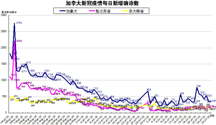 加国生活网小编统计了从5月1日至7月26日每日新增确诊数,制作了如下曲线图,分别统计了全加拿大(蓝色)和确诊数最多的两个省魁北克省(粉色)和安省(黄色)三组数据,大家可以了解一下进行5月份以来加拿大新冠疫情的发展趋势。加拿大较昨天又小小上升,从昨天的350下降到今天的355,主要是因为艾省和BC省在周末没有最新数据更新;新斯科舍省从昨天的37上升到今天的42;魁省有小下降,从昨天的171下降到今天的169;安省则从昨天的138下降到今天的137。
