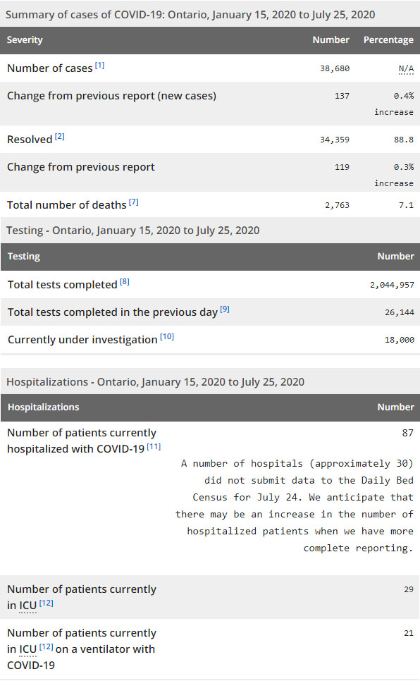 再看看安省方面的详细数据,截止7月25日上午10:30点,安省已对2044957例行了新冠病毒检测(检测数较昨天新增26144例),还有18000处于被调查阶段。确诊总数38680(较昨天新增137,确诊率上升至0.52%),包括34359例康复(康复率仍为88.8%)、2763例死亡(截止7月26日死亡2792例,这是CBC统计的最新死亡数据,死亡人数当天清零,死亡率仍为7.2%)。住院患者87例(约30家医院没有在7月24日提交数据,估计明天此数据有可能会增加);进入ICU患者29例(减少1);IU插呼吸机患者21例(未变)。
