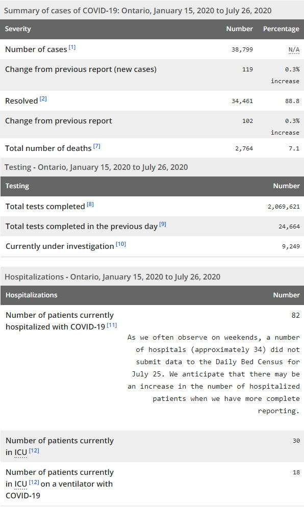 再看看安省方面的详细数据,截止7月26日上午10:30点,安省已对2069621例行了新冠病毒检测(检测数较昨天新增24664例),还有9249处于被调查阶段。确诊总数38799(较昨天新增119,确诊率上升至0.48%),包括34461例康复(康复率仍为88.8%)、2764例死亡(截止7月27日死亡2799例,这是CBC统计的最新死亡数据,死亡人数较昨天增加7例,死亡率仍为7.2%)。住院患者82例(约34家医院没有在7月25日提交数据,估计明天此数据有可能会增加);进入ICU患者30例(增加1);IU插呼吸机患者18例(减少3)。