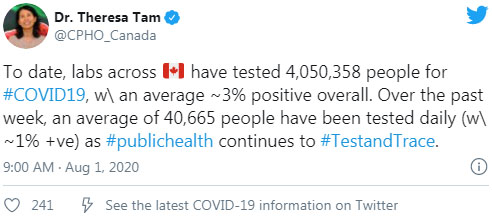 —— 根据加拿大首席卫生官Dr. Theresa Tam在其Twitter所发布的数据显示,截止8月1日,加拿大共检测了 4,050,358,当天确诊116599,确诊率为3%(实际是2.88%,世界卫生组织设定的目标是使阳性确诊率保持在5%以下)。 在过去一周中,每天平均有约40,665人接受测试。