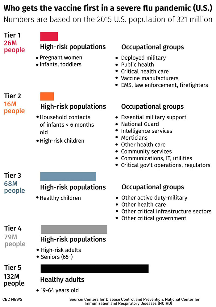美国疾病控制与预防中心针对流感大流行的不同级别提供了更详细的优先级列表(COVID-19被认为等同于最高级别):