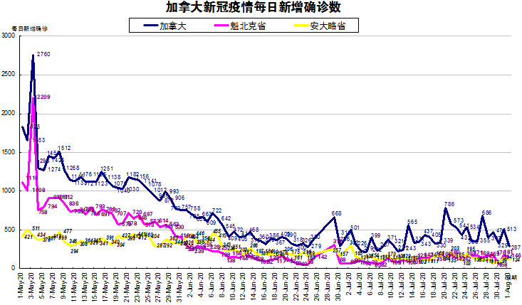 加国生活网小编统计了从5月1日至8月1日每日新增确诊数,制作了如下曲线图,分别统计了全加拿大(蓝色)和确诊数最多的两个省魁北克省(粉色)和安省(黄色)三组数据,大家可以了解一下进行5月份以来加拿大新冠疫情的发展趋势。加拿大较昨天又大幅下降,主要是因为艾省和BC省周末没有数据更新,只有新斯科舍省的数据,从昨天的13上升到今天的15;加东方面,魁省从昨天的181下降到今天的146;安省则从昨天的134下降到今天的124,连续二天又重新回到100以上,唉!