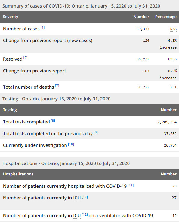 再看看安省方面的详细数据,截止7月31日,安省已对2205254例行了新冠病毒检测(检测数较昨天新增33282例),还有26984处于被调查阶段。确诊总数39333(较昨天新增124,确诊率下降至0.37%),包括35237例康复(康复率上升至89.6%)、2777例死亡(截止8月1日死亡2812例,这是CBC统计的最新死亡数据,死亡人数较昨天增加1例,死亡率下降至7.1%)。住院患者73例(减少5);进入ICU患者27例(减少2);IU插呼吸机患者12例(减少3)。