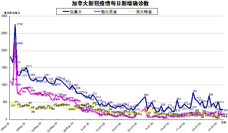 加国生活网小编统计了从5月1日至8月2日每日新增确诊数,制作了如下曲线图,分别统计了全加拿大(蓝色)和确诊数最多的两个省魁北克省(粉色)和安省(黄色)三组数据,大家可以了解一下进行5月份以来加拿大新冠疫情的发展趋势。加拿大较昨天没有太大变化,从昨天的287下降至今天的285,主要还是因为艾省和BC省周末没有数据更新;加东方面,魁省从昨天的146下降到今天的141;安省则从昨天的124下降到今天的116,连续三天又重新回到100以上,唉!