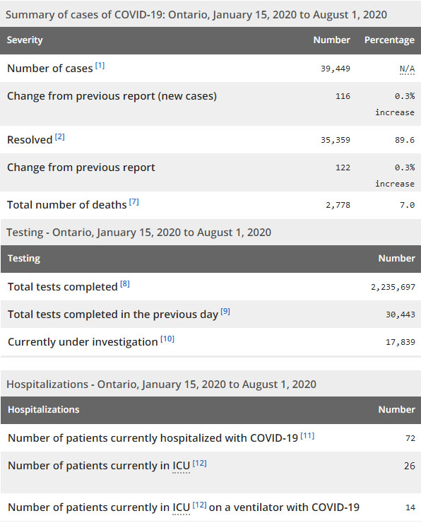 再看看安省方面的详细数据,截止8月1日,安省已对2235697例行了新冠病毒检测(检测数较昨天新增30443例),还有17839处于被调查阶段。确诊总数39449(较昨天新增116,确诊率上升至0.38%),包括35359例康复(康复率仍为89.6%)、2778例死亡(截止8月2日死亡2813例,这是CBC统计的最新死亡数据,死亡人数较昨天增加1例,死亡率下降至7.1%)。住院患者72例(减少1);进入ICU患者26例(减少1);IU插呼吸机患者14例(增加2)。