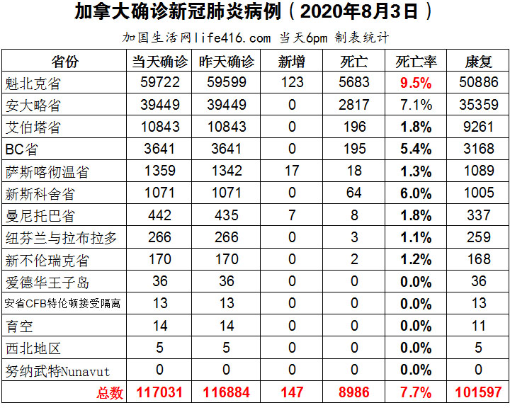 【加国生活网编译报道】截至8月3日下午6点,加拿大确诊新冠病例总数117031(当日新增147),死亡8986。因为Civic Day假期,安省、艾省和BC省等均在当天没有更新数据,只有魁省、萨省和曼省更新了数据,其中魁省确诊总数59722(当日新增123)。加拿大人正在改变长周末假期方式;COVID Alert应用程序遭到一些质疑;魁省从8月3日起放宽限制,允许最多250人团体聚会;加拿大首席公共卫生官呼吁国民一定要注意健康防护,全力遏制第二波疫情卷土重来。加国生活网专门制作了如下统计数据表:
