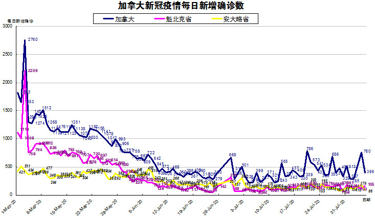 加国生活网小编统计了从5月1日至8月5日每日新增确诊数,制作了如下曲线图,分别统计了全加拿大(蓝色)和确诊数最多的两个省魁北克省(粉色)和安省(黄色)三组数据,大家可以了解一下进行5月份以来加拿大新冠疫情的发展趋势。由于艾省、BC省和安省终于更新数据,加拿大较昨天有大幅下降,主要原因是恢复了每日更新,魁省从昨天的123上升到今天的155;安省从昨天的91例下降到86,连续3天低于100例。艾省和BC省的情况不妙,今天新增94,甚至超过了安省;BC省今天新增47,也是比以往几天都高。