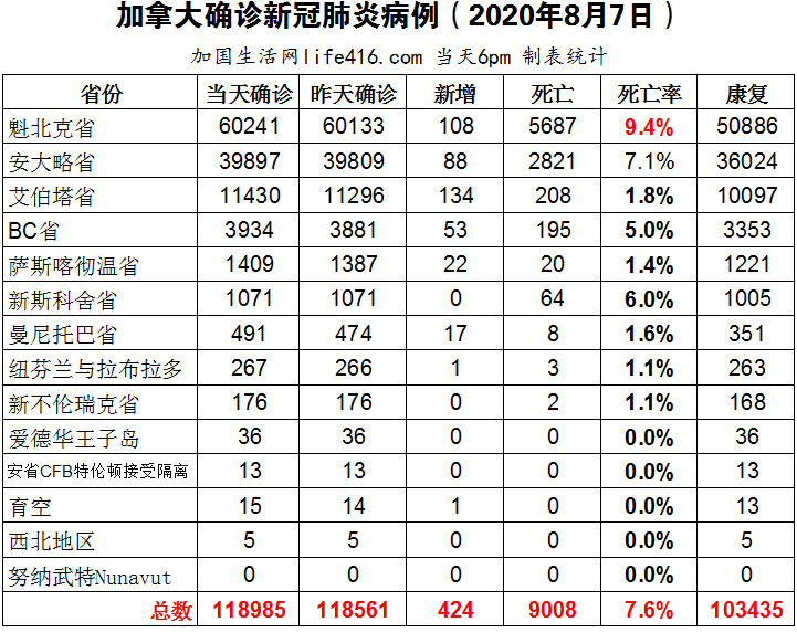 【加国生活网编译报道】截至8月7日下午6点,加拿大确诊新冠病例总数118985(当日新增424),死亡9008。魁省确诊总数60241(当日新增108);安省确诊总数39897(当日新增88,连续五天100例以下)。艾省确诊总数11430(当日新增134);BC省确诊总数3934(当日新增53)。加拿大失业率进一步降至10.9%;安省省长和教育部长为9月返校计划辩护,称学生健康是重中之重,但无意重新考虑该计划。加国生活网专门制作了如下统计数据表: