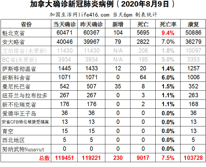 【加国生活网编译报道】截至8月9日下午6点,加拿大确诊新冠病例总数119451(当日新增230),死亡9017。魁省确诊总数60471(当日新增104);安省确诊总数40046(当日新增79,连续第七天100例以下;从3万到4万用了2个月时间);艾省和BC省周末没有更新。曼尼托巴省当日新增35例确诊病例,是自新冠疫情开始以来的最高值;多伦多8月9日新增25例确诊病例,是安省当日新增79例中所占病例最多的地区。加国生活网专门制作了如下统计数据表: