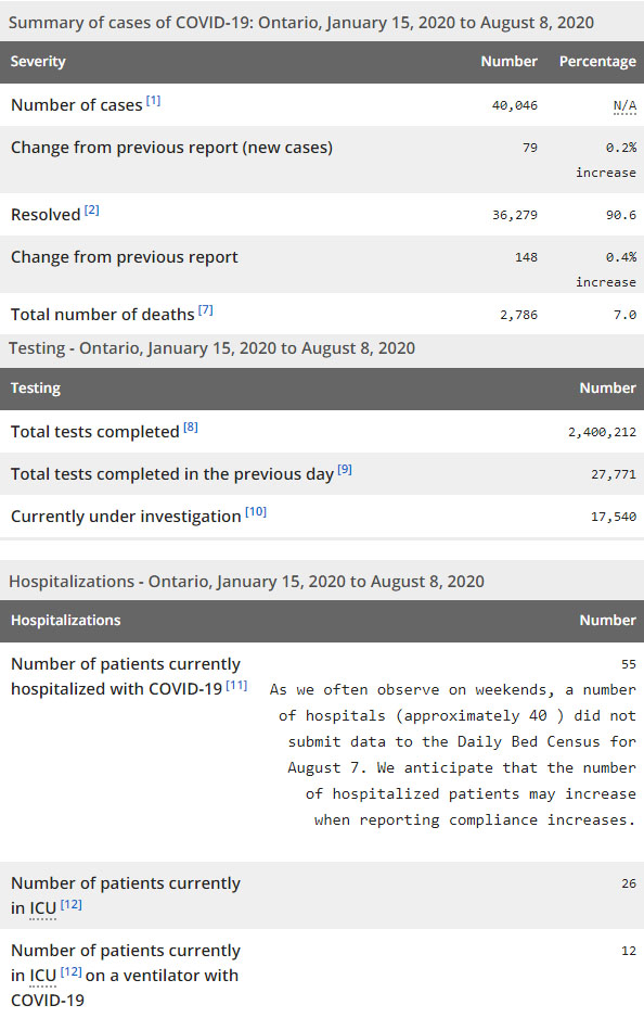再看看安省方面的详细数据,截止8月8日,安省已对2400212例行了新冠病毒检测(检测数较昨天新增27771例),还有17540处于被调查阶段。确诊总数40046(较昨天新增79,确诊率上升至0.28%),包括36279例康复(康复率上升至90.6%)、2786例死亡(截止8月9日死亡2822例,这是CBC统计的最新死亡数据,死亡人数较昨没有增加,死亡率下降至7.0%)。住院患者55例(由于周末医院又没有上报最新数据,这个数据很快会大幅增加);进入ICU患者26例(减少1);IU插呼吸机患者12例(未变)。