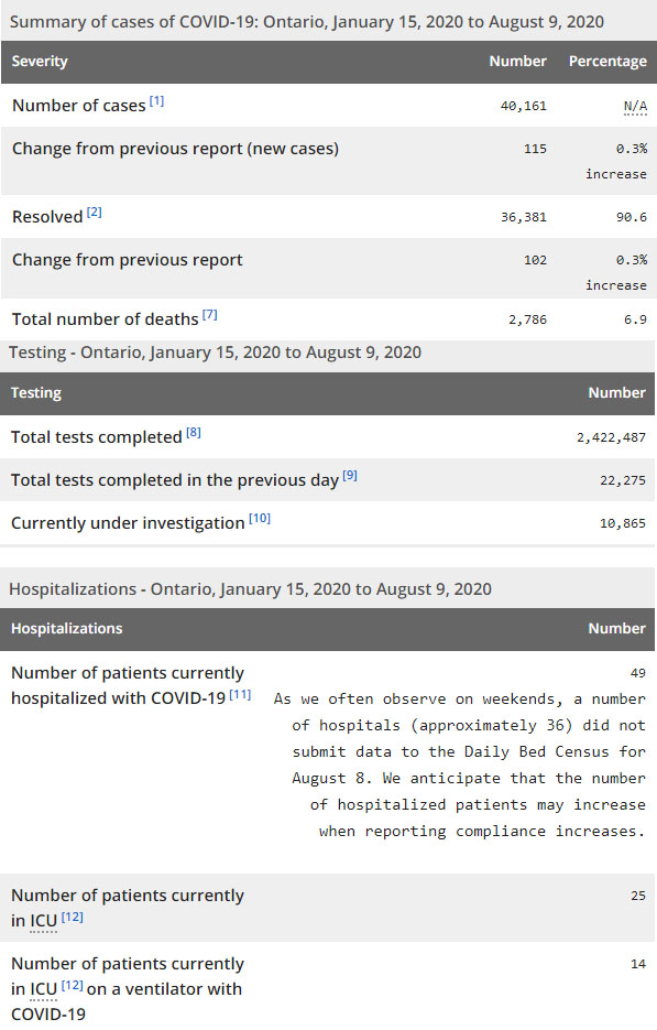 再看看安省方面的详细数据,截止8月9日,安省已对2422487例行了新冠病毒检测(检测数较昨天新增22275例),还有10865处于被调查阶段。确诊总数40161(较昨天新增115,确诊率上升至0.52%),包括36381例康复(康复率仍为90.6%)、2786例死亡(截止8月10日死亡2824例,这是CBC统计的最新死亡数据,死亡人数较昨天增加2例,死亡率下降至7.0%)。住院患者49例(由于周末医院又没有上报最新数据,这个数据很快会大幅增加);进入ICU患者25例(减少1);IU插呼吸机患者14例(增加2)。