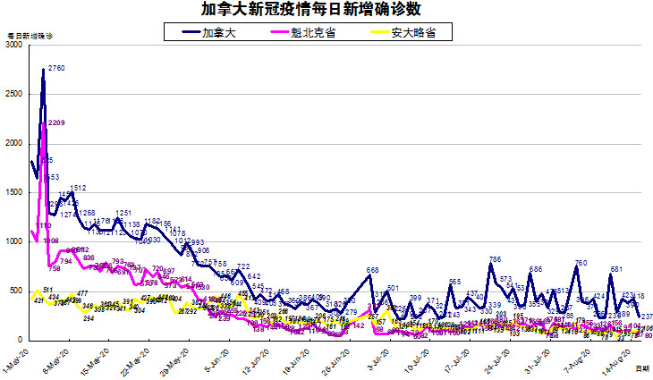 加国生活网小编统计了从5月1日至8月15日每日新增确诊数,制作了如下曲线图,分别统计了全加拿大(蓝色)和确诊数最多的两个省魁北克省(粉色)和安省(黄色)三组数据,大家可以了解一下进行5月份以来加拿大新冠疫情的发展趋势。加拿大较昨天又有大幅下降,从昨天的418下降至今天的237,主要是又到周末啦,艾省和BC省又不更新了,唉,现在加西省份上升趋势十分明显,有取代加东省份的势头。加东方面,魁省从昨天的87下降至今天的80;安省从昨天的92例上升至今天的106,再次突破100以上。