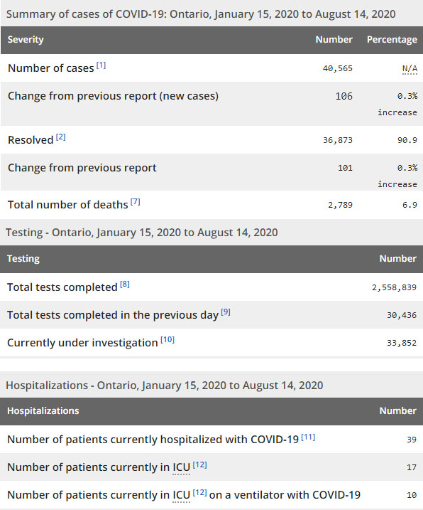 再看看安省方面的详细数据,截止8月14日,安省已对2558839例行了新冠病毒检测(检测数较昨天新增30436),还有33852处于被调查阶段。确诊总数40565(较昨天新增106,确诊率上升至0.35%),包括36873例康复(康复率仍为90.9%)、2789例死亡(截止8月15日死亡2827例,这是CBC统计的最新死亡数据,死亡人数较昨天没有增加,死亡率仍为7.0%)。住院患者39例(减少2);进入ICU患者17例(未变);IU插呼吸机患者10例(增加1)。