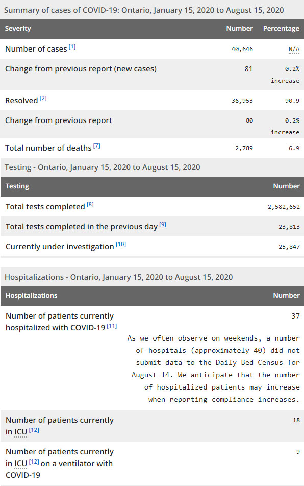再看看安省方面的详细数据,截止8月15日,安省已对2582652例行了新冠病毒检测(检测数较昨天新增23813),还有25847处于被调查阶段。确诊总数40646(较昨天新增81,确诊率下降至0.20%),包括36953例康复(康复率仍为90.9%)、2789例死亡(截止8月16日死亡2827例,这是CBC统计的最新死亡数据,死亡人数较昨天没有增加,死亡率仍为7.0%)。住院患者37例(减少2);进入ICU患者18例(增加1);IU插呼吸机患者9例(减少1)。