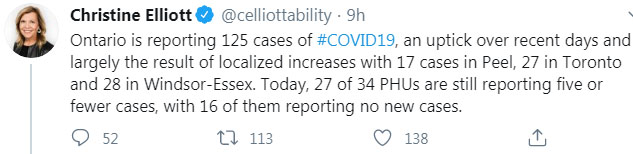 —— 安省在8月18日新增125例,再一次超过100例,而且还创自8月以来的最高值。在地区方面,Windsor-Essex地区28例、多伦多27例、皮尔区17例、滑铁卢12例,其它地区没有超过10例。安省卫生厅长叶丽雅(Christine Elliott)当天发推说,“从各地区来看,34个公共卫生局中,有27个最多增加5例或更少,其中16个则完全没有报告新增病例。”