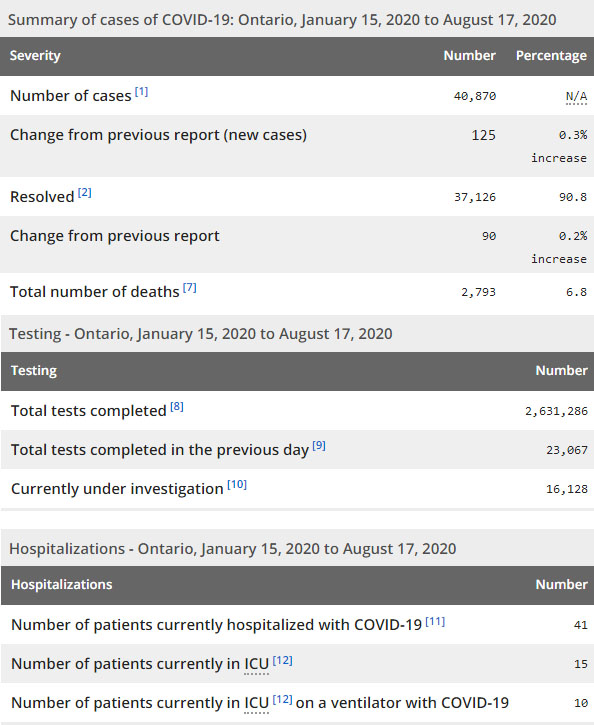 再看看安省方面的详细数据,截止8月17日,安省已对2631286例行了新冠病毒检测(检测数较昨天新增23067),还有16128处于被调查阶段。确诊总数40870(较昨天新增125,确诊率上升至0.54%),包括37126例康复(康复率下降为90.8%)、2793例死亡(截止8月18日死亡2828例,这是CBC统计的最新死亡数据,死亡人数较昨天增加1例,死亡率仍为6.9%)。住院患者41例(增加9);进入ICU患者15例(减少1);IU插呼吸机患者10例(未变)。