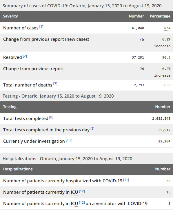 再看看安省方面的详细数据,截止8月19日,安省已对2682845例行了新冠病毒检测(检测数较昨天新增25917),还有22104处于被调查阶段。确诊总数41048(较昨天新增76,确诊率下降至0.29%),包括37291例康复(康复率仍为90.8%)、2793例死亡(截止8月20日死亡2829例,这是CBC统计的最新死亡数据,死亡人数较昨天增加1例,死亡率仍为6.9%)。住院患者35例(减少7);进入ICU患者15例(未变);IU插呼吸机患者8例(减少2)。