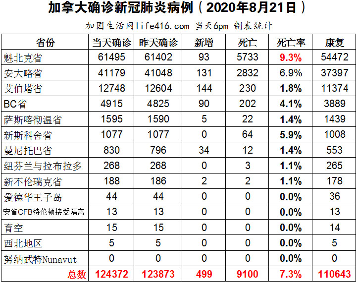 【加国生活网编译报道】截至8月21日下午6点,加拿大确诊新冠病例总数124372(当日新增499),死亡9100。艾省确诊总数12748(当日新增144);安省确诊总数41179(当日新增131);魁省确诊总数61495(当日新增93);BC省确诊总数4915(当日新增90)。BC执法人员现在有权对在疫情大流行期间违反公共卫生命令的大型活动负责人处以最高2,000加元的罚款;安省当日新增131确诊病例再创8月新高;联邦政府EI三项新福利计划的申请案例说明。加国生活网专门制作了如下统计数据表: