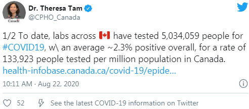 ——根据加拿大首席卫生官Dr. Theresa Tam在其Twitter所发布的数据显示,截止8月22日,加拿大共检测了5,034,059,确诊率为2.3%(较8月8日的2.73%又有所下降,世界卫生组织设定的目标是使阳性确诊率保持在5%以下)。每100万人口中共有133,923人接受测试。