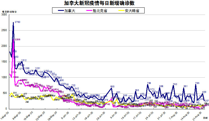 加国生活网小编统计了从5月1日至8月22日每日新增确诊数,制作了如下曲线图,分别统计了全加拿大(蓝色)和确诊数最多的两个省魁北克省(粉色)和安省(黄色)三组数据,大家可以了解一下进行5月份以来加拿大新冠疫情的发展趋势。加拿大较昨天又有大幅下降升,从昨天的499下降至今天的257,主要原因又是艾省和BC省逢周末不更新,已更新的省份中,安省第一新增108、魁省第二新增104、曼省第三42(创自疫情以来的最高值)。